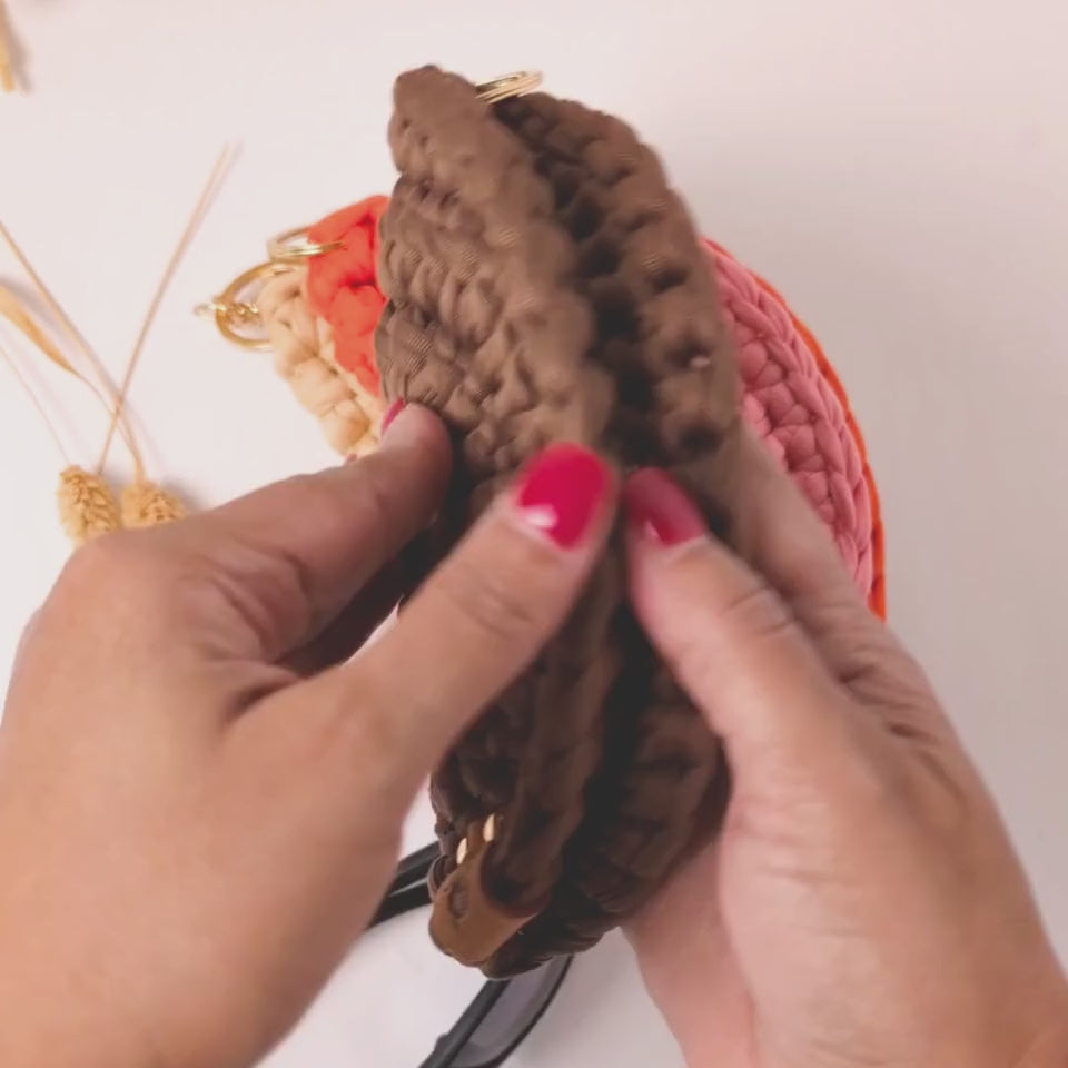 Perfect for the woman on the go. Each case is crafted with soft, durable crochet yarn and finished with luxe gold keychain hardware so you can clip it to your tote, keys, or backpack for easy access.